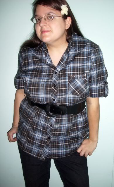 Well here is what I wore to work today and when I went out before work also. I think I'm trying to hard to show off the flower. I got a few complements on that flower. Such as: "Flower Child, Is that a flower, cute." I really like this outfit so much. People at work are noticing that I am dressing better. And that I look better. If only I had an endless supply of cute, nice Clothes. *sigh* Oh well.....